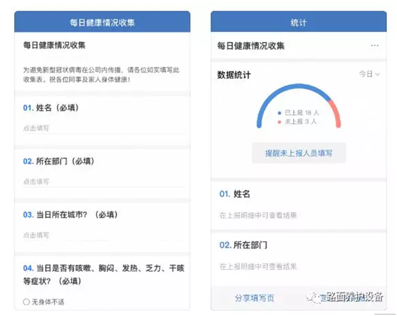 感染新型冠状病毒的典型症状有发热、咳嗽等,为了确保全员健康,公司每日对员工健康状况进行跟踪,建立台账。每位员工每天在企业微信平台上如实填报自己的体温及健康状况,由行政汇总后存档。